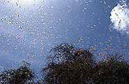 | أن السرب القياسي للجراد الصحراوي المؤلف من نحو ثلاثة مليارات حشرة ناضجة ويغطي نحو ستين كيلومتراً مربعاً، يلتهم ما يصل إلى 375 حمولة مماثلة لحجم حمولة الشحن البرية علي متن شاحنة كبيرة الحجم من المواد الخضراء يومياً |